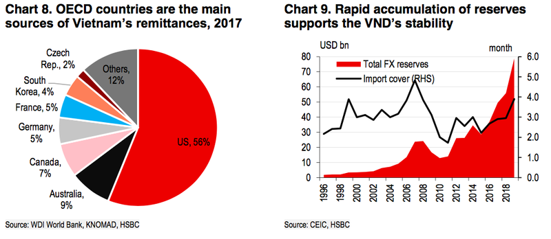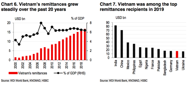 Moreover, the widening secondary income surplus has also supported a favorable CA position. A large chunk of it comes from the consistent injection of remittances, thanks to a large population of Vietnamese migrants overseas. Remittances grew steadily over the past two decades, making Vietnam the fourth largest recipient in Asia, with inflows worth of US$16.7 billion (6.4% of GDP) in 2019. The majority of remittances was sent from OECD countries, with the US alone accounting for more than half.