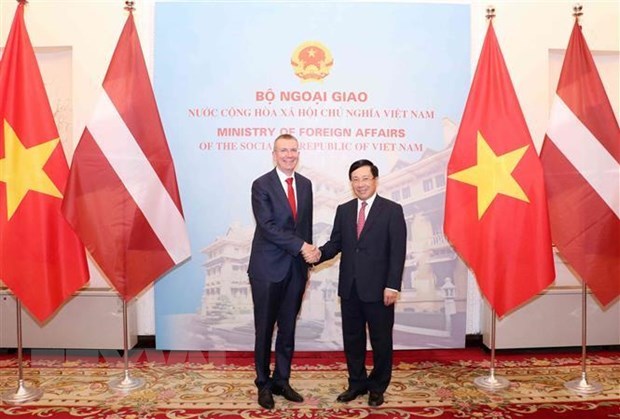 Deputy Prime Minister and Foreign Minister Pham Binh Minh (right) and Latvian Foreign Minister Edgars Rinkevics