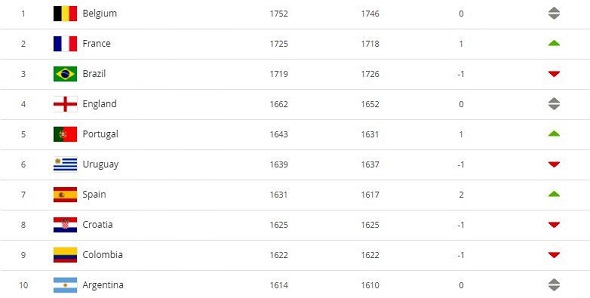 Brazil dropped to third with 1,719 points. The fourth and fifth places are held by England and Portugal with 1,662 points and 1,643 points, respectively.
