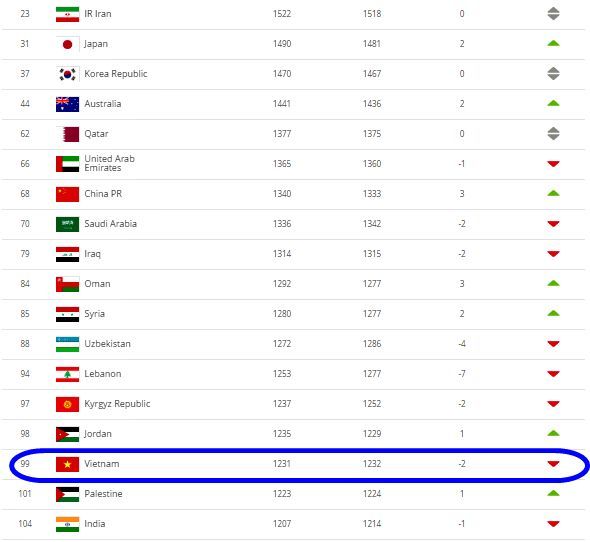 The Vietnamese team dropped two places from 97th to 99th and ranked 16th in Asia.
