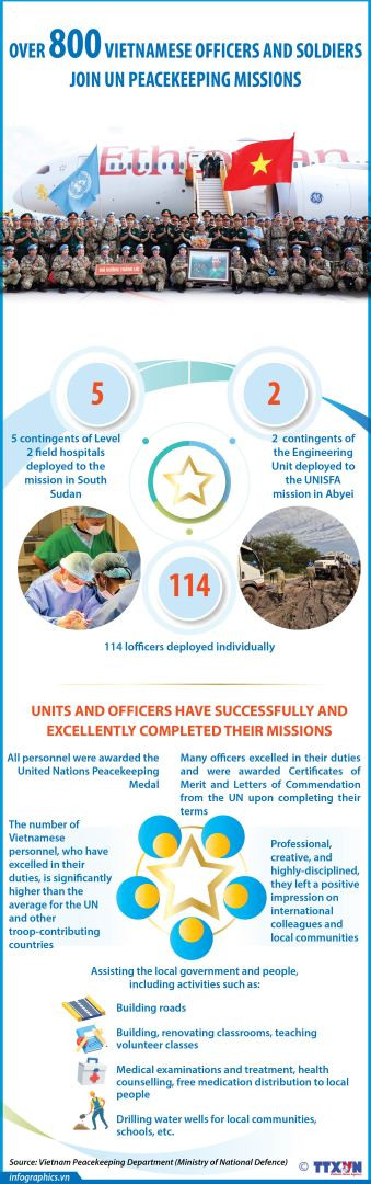 More than 800 military officials and professional personnel of the Vietnamese army and police have been sent to the UN peacekeeping operations such as the UN Mission in South Sudan (UNMISS), the UN Multidimensional Integrated Stabilisation Mission in the Central African Republic (MINUSCA) and the UN Interim Security Force for Abyei (UNISFA) as individuals and units.