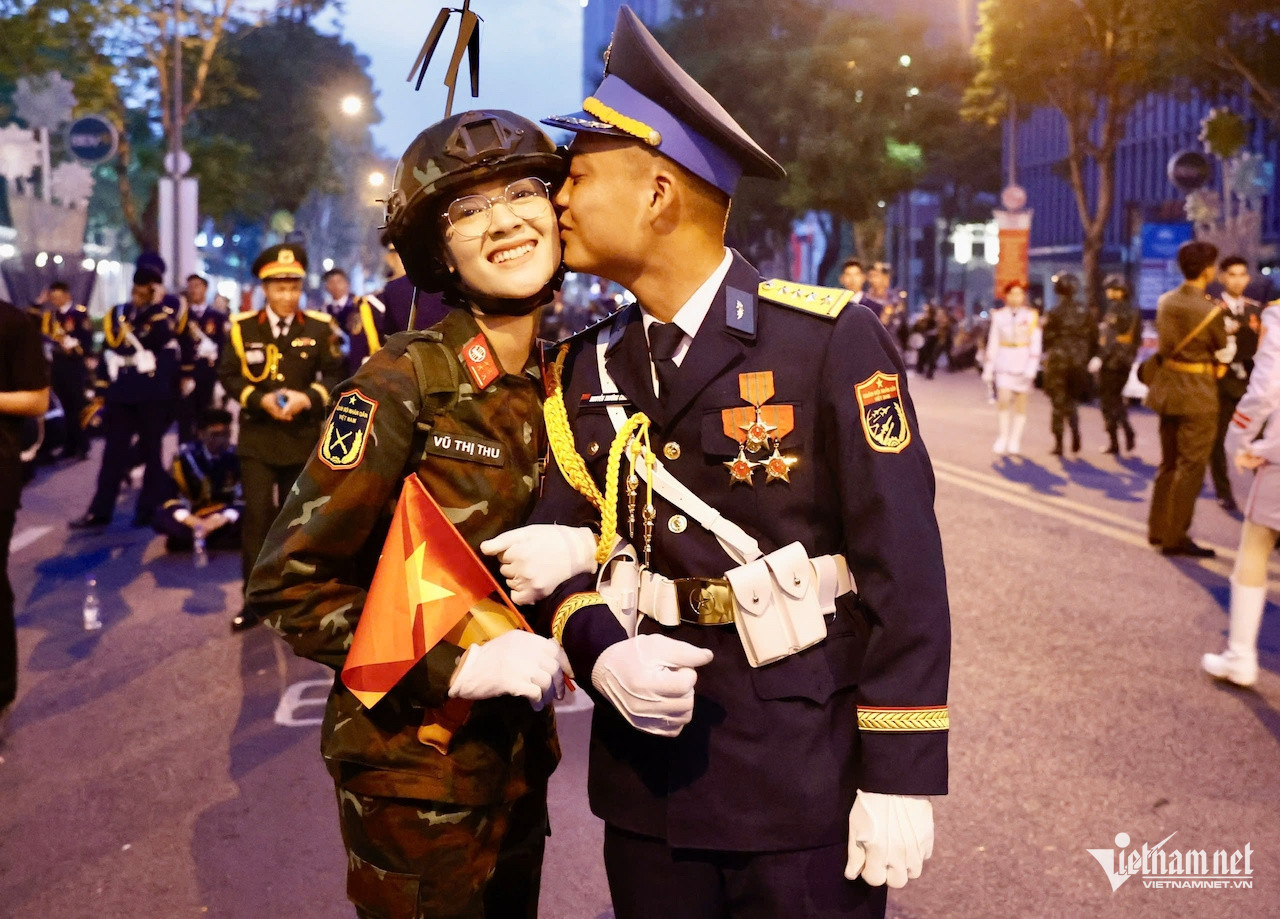 Captain Nguyen Truong Chinh (Air Defense-Air Force block) and Lieutenant Vu Thi Thu (Communications block) met during a previous parade and now marched together again, exchanging a supportive kiss and words of encouragement.