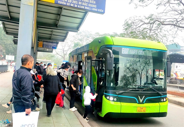 | Hanoian people get on an electric bus. — VNS Photo Đoàn Tùng |