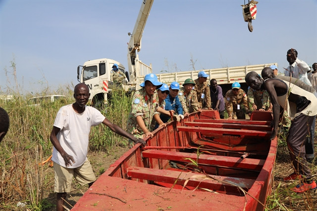 | Việt Nam Peacekeeping Forces at the UNISFA Mission contributed to boat repairs for the people of Mijak village. — VNA/VNS Photo |