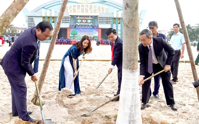| Leaders of Quảng Trị Province plant trees outside a sports competition centre in Vĩnh Linh District. — VNA/VNS Photos |