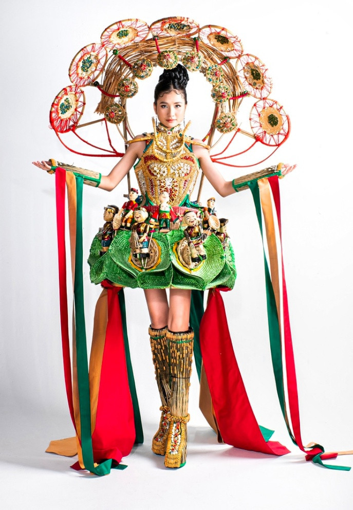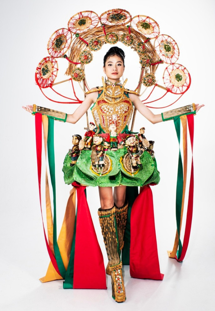 The outfit named “Soul of water” was created by fashion designer Nguyen Huu Binh. It draws inspiration from water puppetry which is a unique traditional folk theatrical art form that was originally born from the nation’s wet-rice culture.