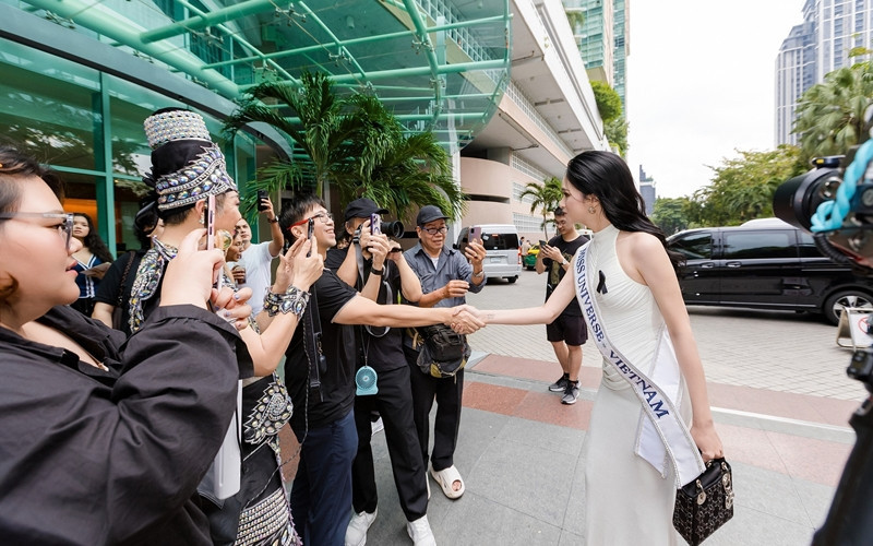 Huong Giang also took time to connect with fans and journalists outside the hotel, happily posing for photos and engaging in cheerful conversation. Her confident smile, charismatic presence, and positive energy left a lasting impression on pageant followers.