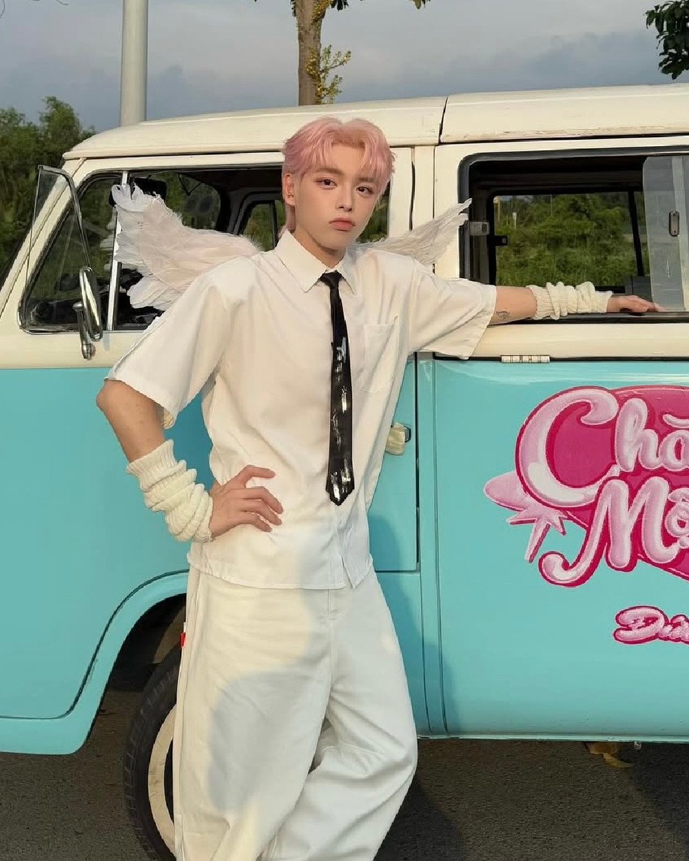 Male artists are increasingly seen wearing dresses, crop tops, painting their nails, decorating their hair with flowers, and adopting more traditionally feminine expressions. Rapper Wean Le, often seen puckering his lips, frequently has his makeup touched up during filming for game shows like Dau truong gia toc.