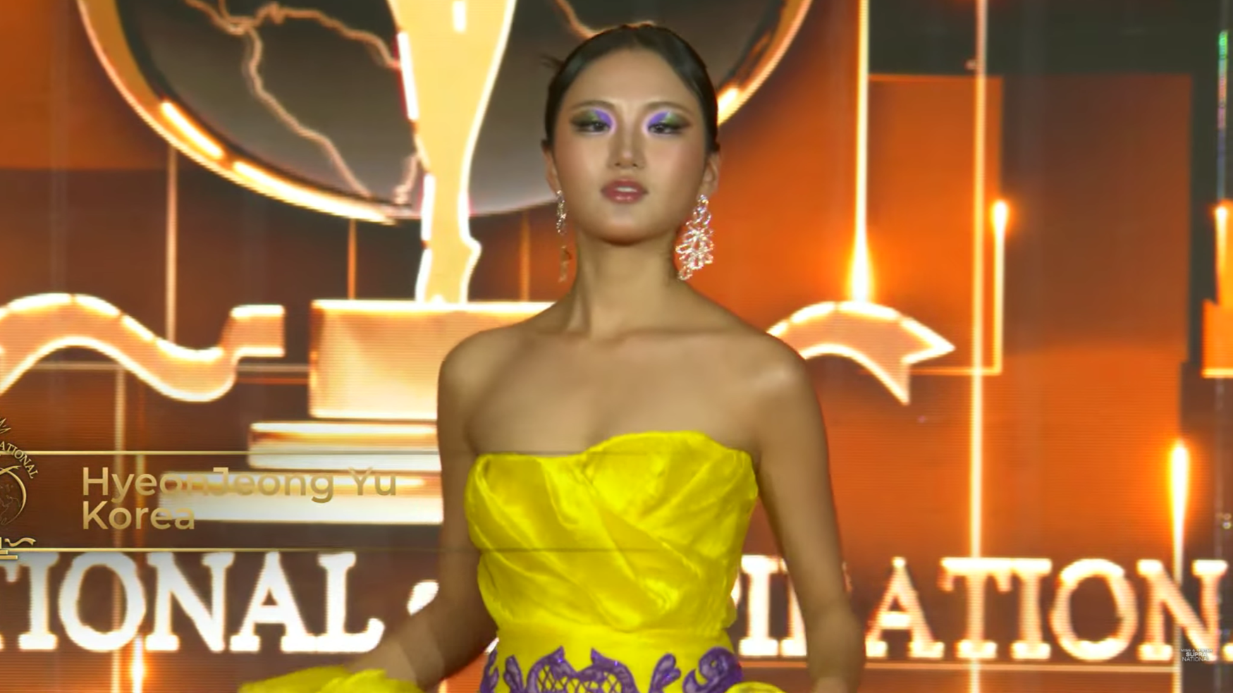 Vietnam's representative, Vo Cao Ky Duyen, stood out in a strapless white gown featuring a corset bodice and high slit, which accentuated her slim waist and long legs. She impressed with her fierce expressions and confident walk.