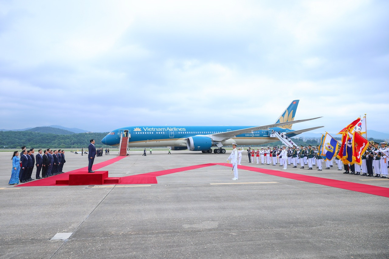 The welcoming ceremony for Prime Minister Pham Minh Chinh, his wife, and the Vietnamese high-ranking delegation was held solemnly at Seongnam Military Airport, attended by senior officials from both countries.