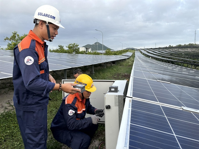 | Engineers from Phong Phú Solar Farm in Tuy Phong District, Bình Thuận Province check the solar power system. — VNS Photo Khánh Dương |