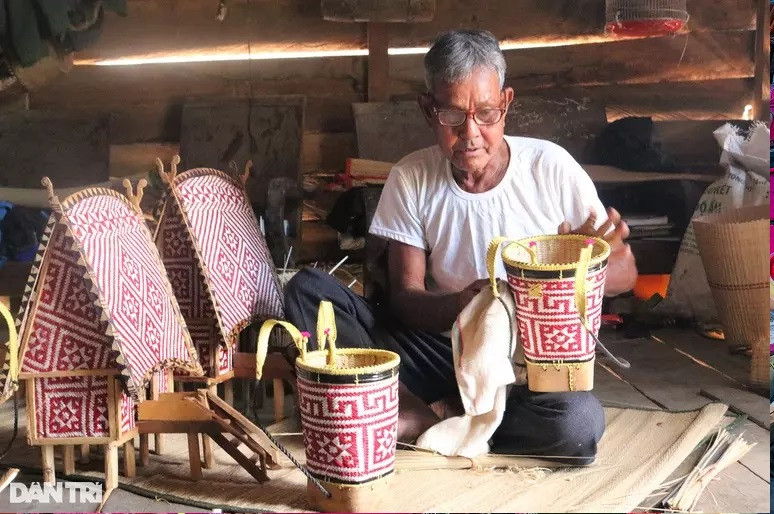 Alongside the small-scale communal house, he also designs beautiful baskets with vibrant colors. Thanks to the handicrafts, he earns millions of VND every day.