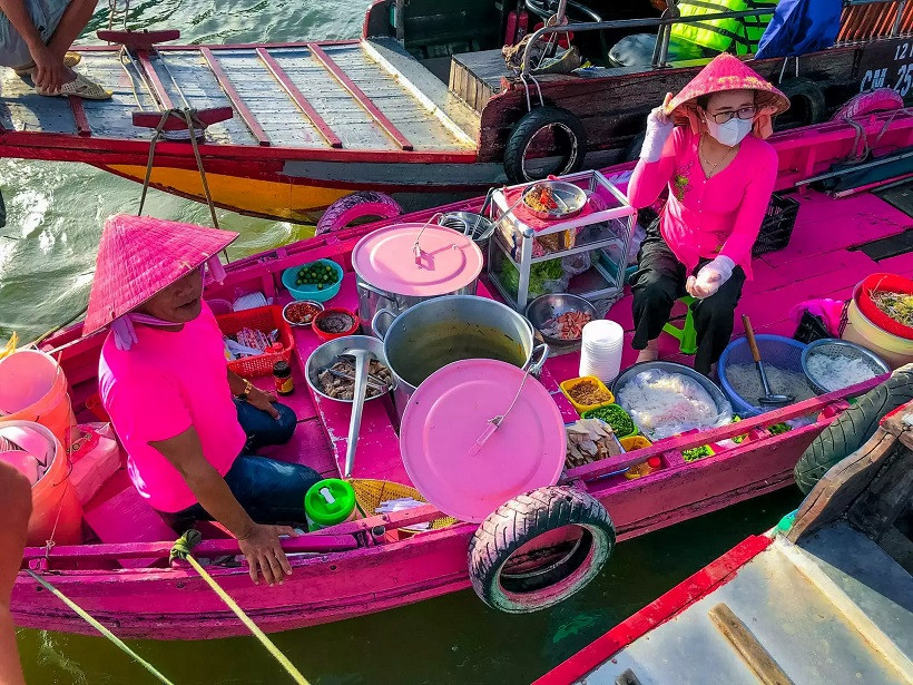 The unique idea came from the owner’s preference for the color pink and his wish to create a spot for tourists who want to take pictures. Since wearing pink on the bun rieu boat, Bao and his wife have been successful, serving 150 bowls every morning, three times higher than before.