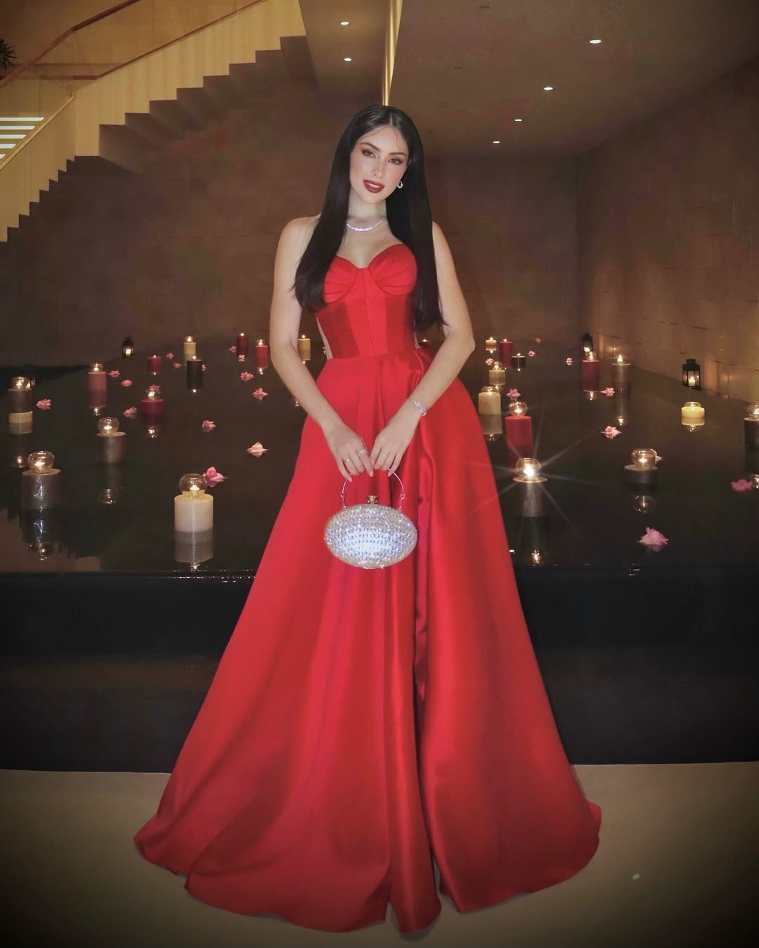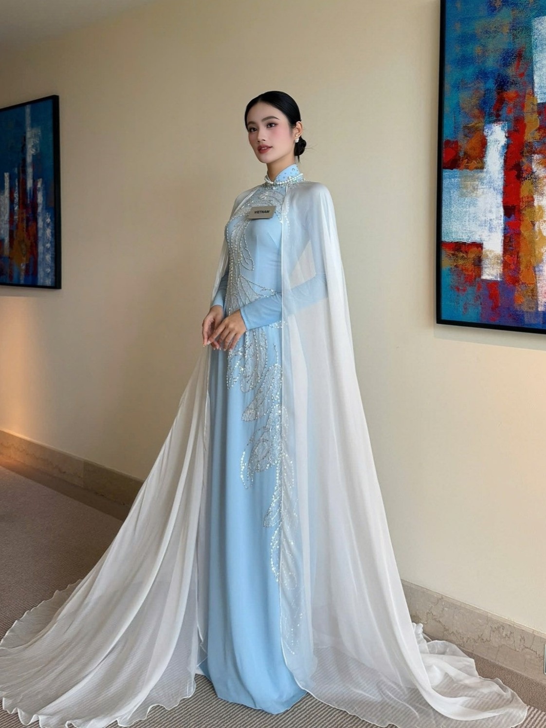 Representing Vietnam, Huynh Tran Y Nhi made a graceful impression in an elegant emerald green áo dài paired with a flowing white voile train. The traditional Vietnamese design not only highlighted her gentle beauty and confidence but also radiated strong cultural identity.
