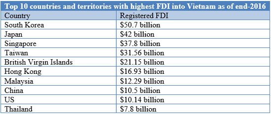 According to numbers from the Foreign Investment Agency (FIA) under the Ministry of Planning and Investment, as of the end of 2016, apart from Peru, Papua New Guinea, and Chile which do not yet have any projects in Vietnam, the other 17 APEC members have already entered the country, registering a total of $230 billion, making up 78.5 per cent of the total FDI flows into Vietnam in the past 30 years.