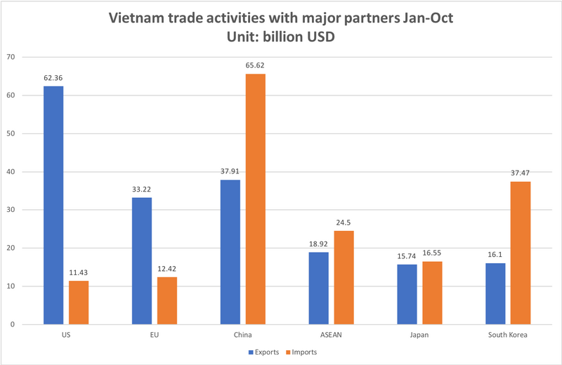 In the January – October period, the US remained Vietnam's biggest export market, spending US$62.36 billion on Vietnamese goods, up 24% year-on-year, followed by China with US$37.91 billion, up 14.8%, and the EU with US$33.22 billion, down 3.8%.