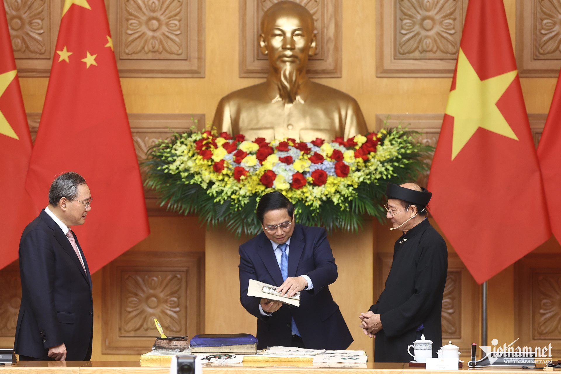 On the afternoon of October 13, during a busy schedule as part of his visit to Vietnam, Prime Minister Pham Minh Chinh and Chinese Prime Minister Li Qiang took a few moments to immerse themselves in traditional Vietnamese culture at the Government Office.