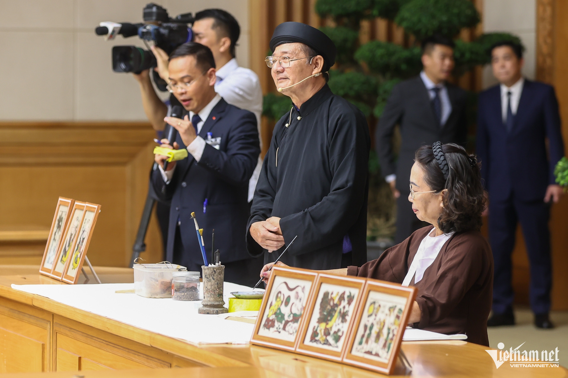 Speaking with VietnamNet, artisans Nguyen Huu Hoa and Nguyen Thi Oanh (from Dong Ho Village, Song Ho Ward, Thuan Thanh District, Bac Ninh) expressed their pride in introducing Dong Ho paintings to the two Prime Ministers.