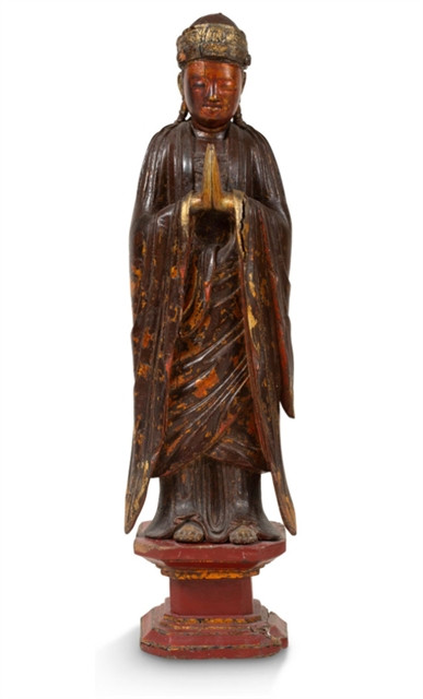 The first is a statuette of Avalokitesvara Guanyin lacquered and gilded in wood with a beautiful patina, standing on a pedestal, hands joined in prayer, dressed in a robe with wide folds belted at the waist, eyes closed in meditation.