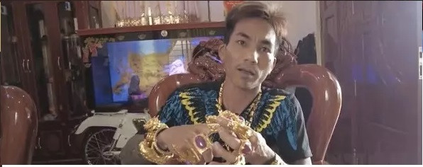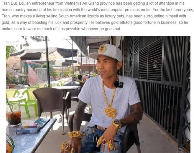 Mr. Thuan wears 10 rings, 30 bracelets and more than 10 gold chains around his neck whenever he works at his restaurant in HCM City or goes out. Photo: OdditycentralThuan says that he has almost been robbed twice. Photo: EearlybulletinsA man from the southern province of An Giang - Mr. Pham Van Loi - also appeared on several foreign news sites for his hobby of wearing dozens of taels of gold whenever he goes out.Mr. Pham Van Loi is 39 years old and lives in Chau Phu district, An Giang province. He claimed that all of his jewelry was genuine gold. Each piece is weighted and carved in a unique design.Mr. Loi began wearing hefty gold jewelry three years ago. Previously, he solely wore ivory-crafted items. However, after a while, he realized that these objects were not bringing him luck. The gold jewelry he wears on his body is large and heavy. He began to wear jewelry composed of valuable stones. To obtain the stones he desired, he sought and collected in stores and even went to the auction forums.