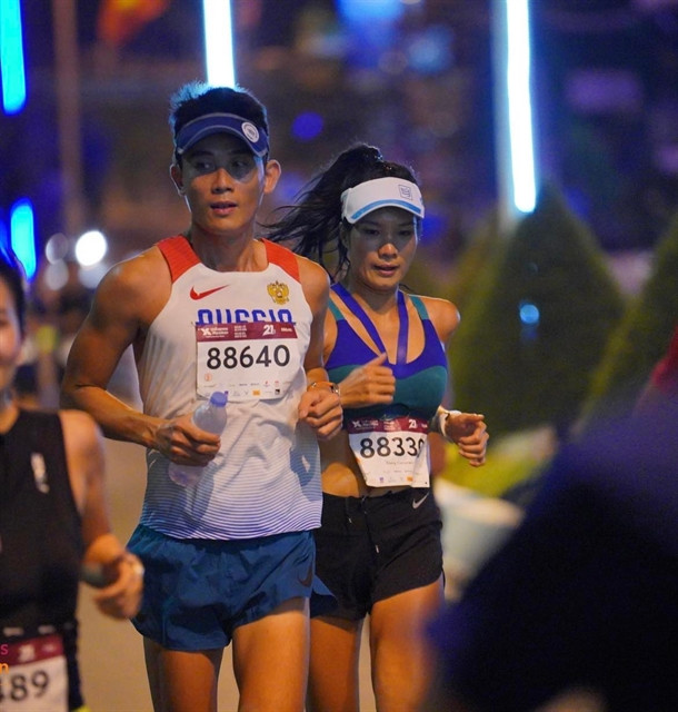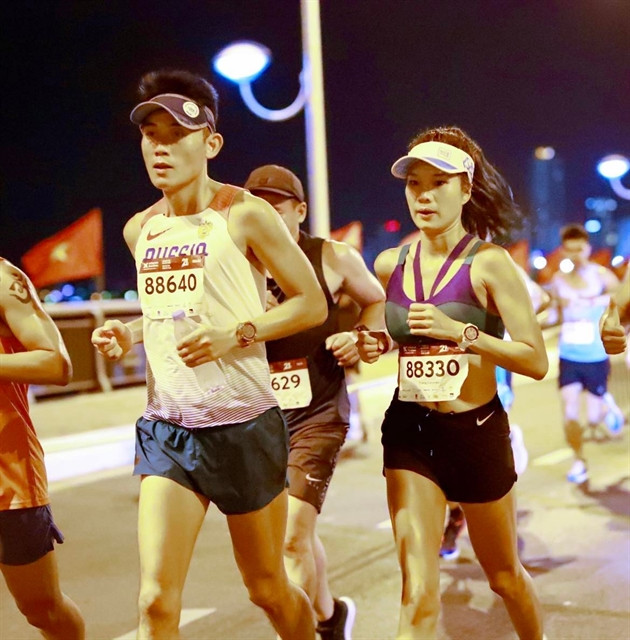 | Định and his wife Trang run at the Marathon Mavelous Nha Trang in 2022. -- Photo vm.vnexxpress.net |