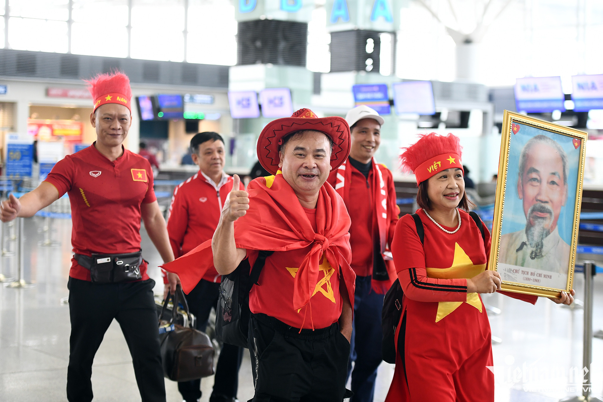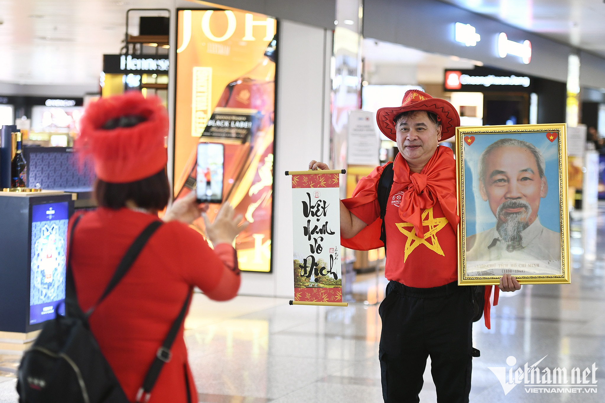 Mr. Pham Van Thuc with the banner "Vietnam - the champion" has followed the team to all matches in Vietnam and overseas. For the past few decades, he has always carried a portrait of President Ho Chi Minh to all matches. His wife, Ms. Le Thi Hong An, joined this trip with Thuc.