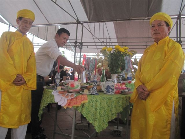 | Two elderly people from Hà My Village prepare an offering to remember the dead. VNS Photo Công Thành |