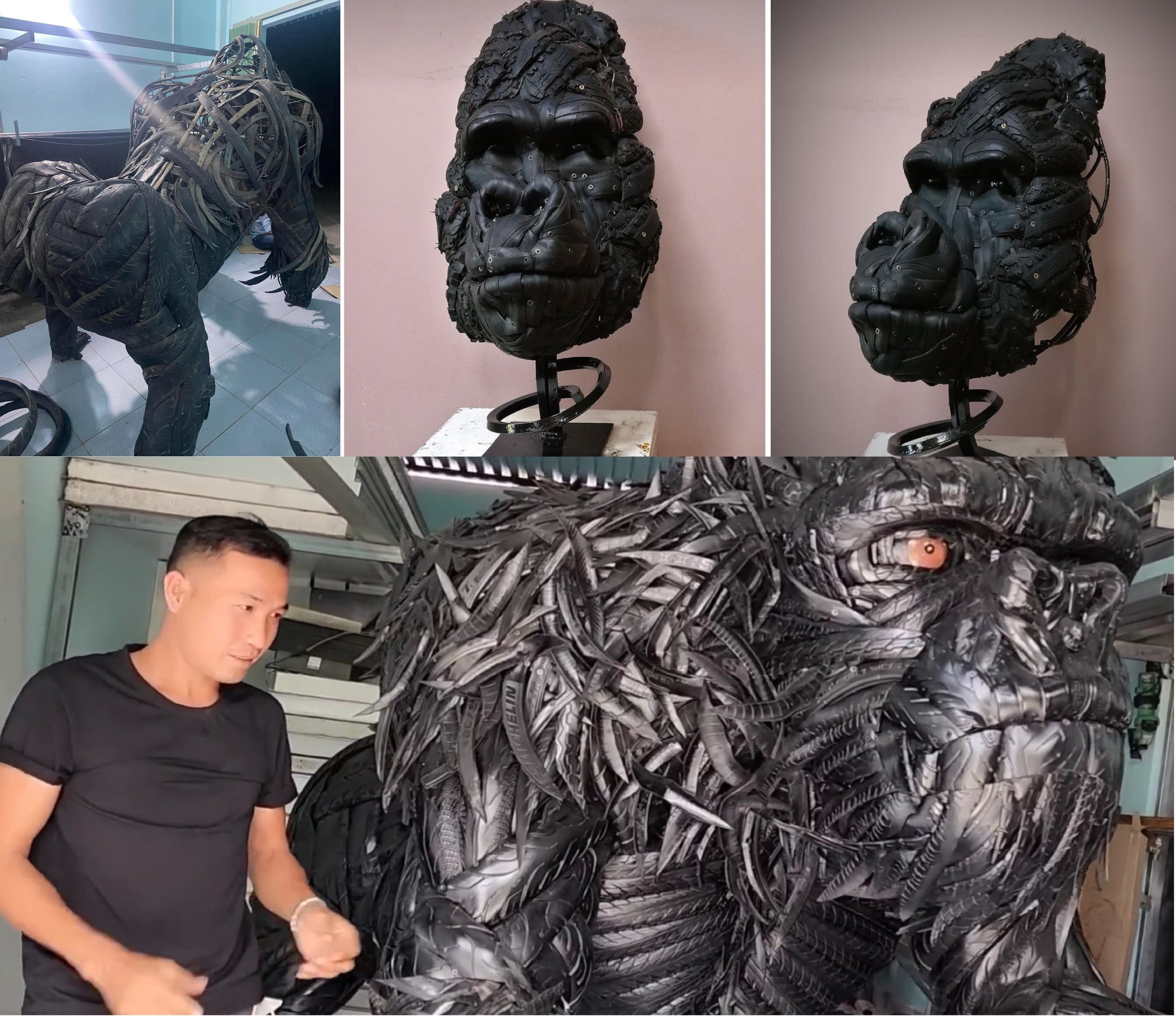 The outer fur of the King Kong was made entirely from old motorbike tires, while the frame was created from iron and steel and its eyes from two soup spoons which were painted by Trieu to show the power of the gorilla king.