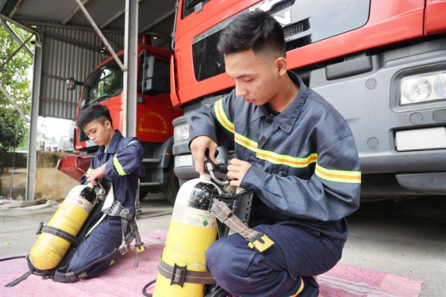Two firefighters, Nguyễn Quốc Trung (left) and Nguyễn Hữu Nam prepare firefighting equipment. VNA/VNS Photo |