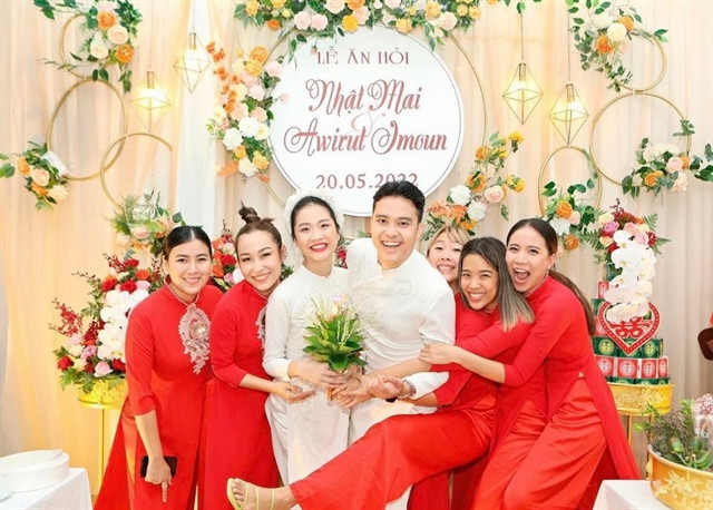 | Awirut and Nhật Mai were pictured at their wedding with their Thai friends wearing Áo Dài as bridesmaids. — Photos courtesy of Awirut and Nhật Mai |