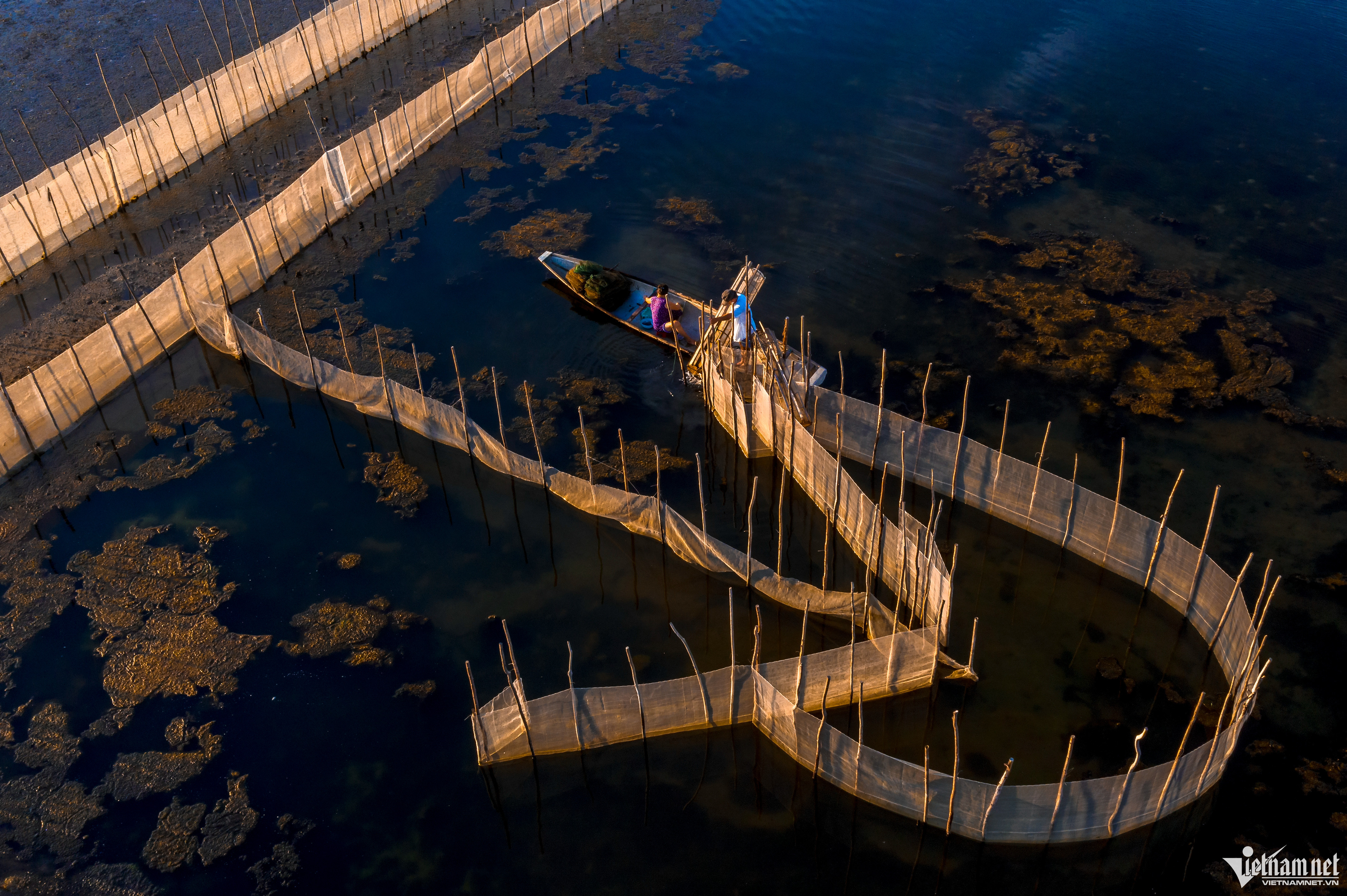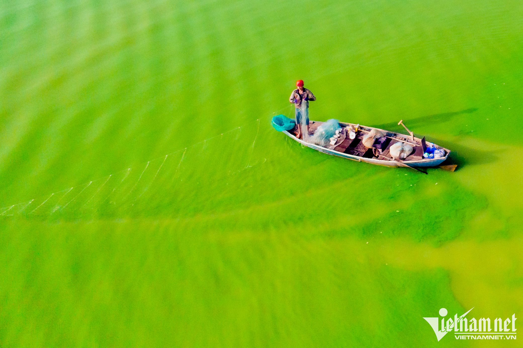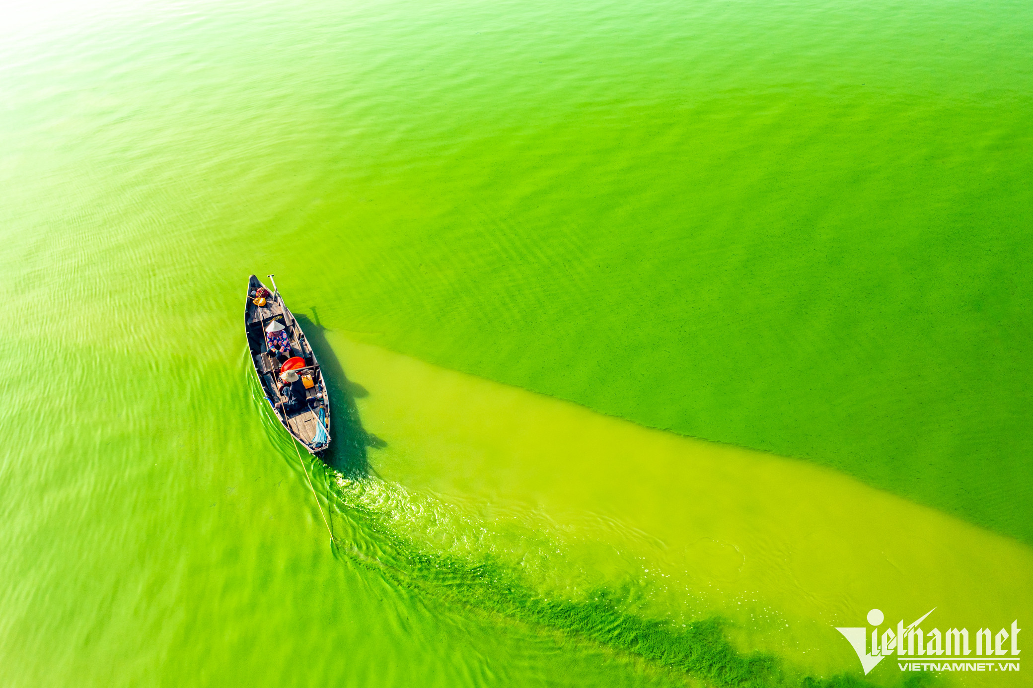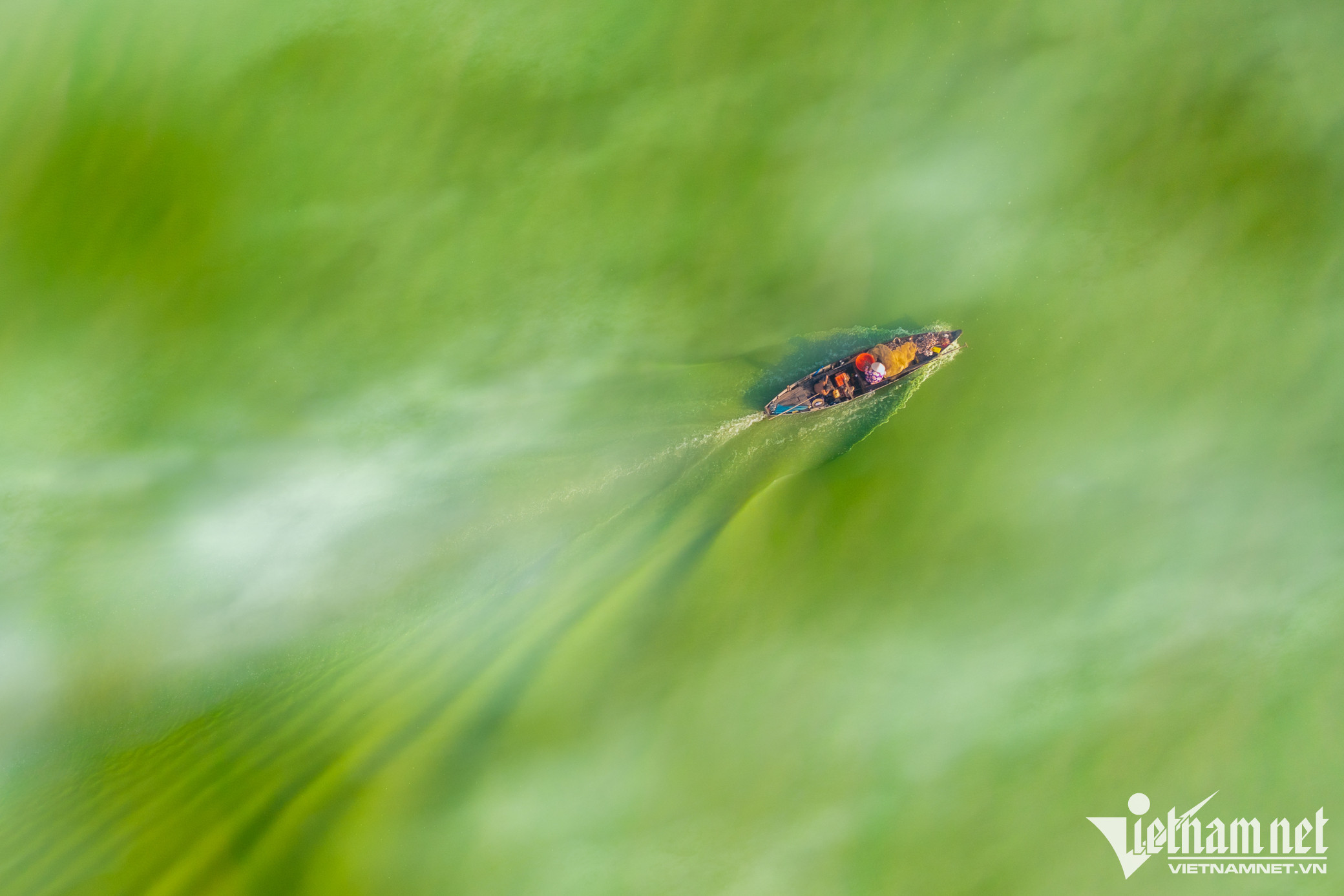 Ben Nom (Dinh Quan, Dong Nai province) is a branch of Tri An hydropower reservoir. In the summer, algae thrives, creating a bright green color stretching across the area, and when the water dries up, the surrounding mounds are exposed. Fishing boats on Tri An Lake are anchored close together around the shore to dry nets. The brown strips of land are in contrast with the green color of the algae, creating a poetic scene.