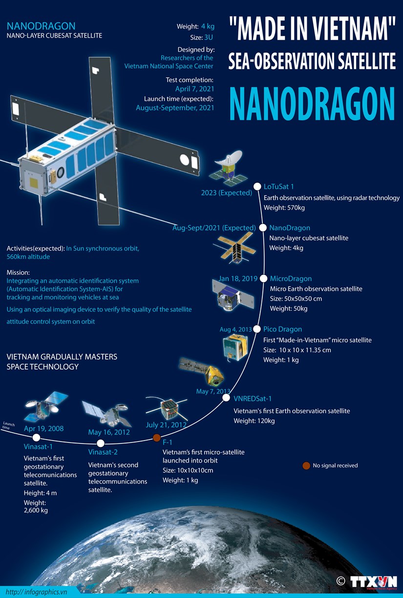 NanoDragon is a satellite wholly designed and manufactured in Vietnam and is a product included in the development roadmap of "Made in Vietnam" small satellites of the Vietnam Space Center to implement the strategy on "Development and application of space science and technology until 2030".