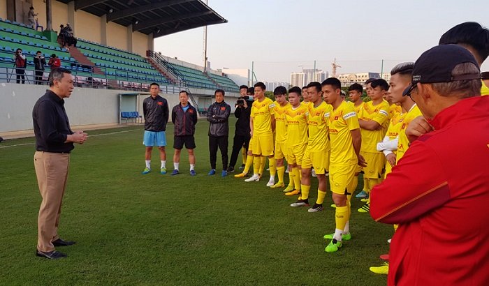 Permanent Vice President of the Vietnam Football Federation Tran Quoc Tuan encourages the players ahead of their Sunday training session. (Photo: VFF)