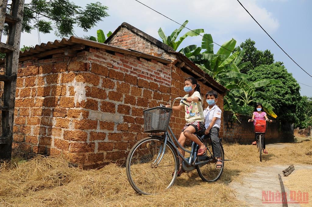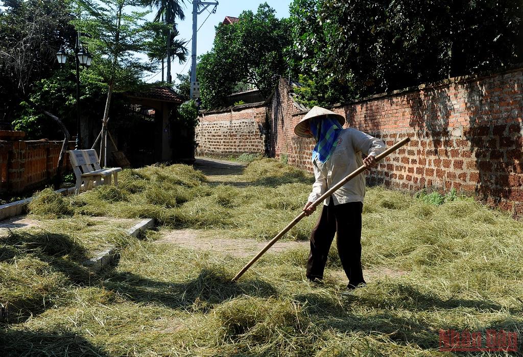During the rice harvesting season, the village roads in Duong Lam, Son Tay Town, are covered with dry straw.