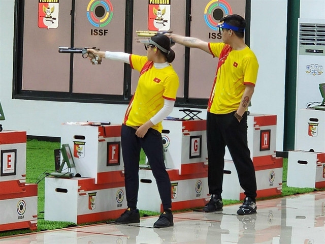 Trịnh Thu Vinh (left) and teammate Phạm Quang Huy compete and win a silver in the Asian Rifle/Pistol Cup's 10m air pistol mixed double event in March in Indonesia. Photo of VSF |