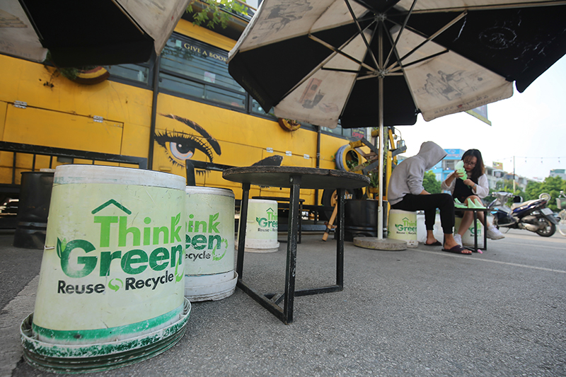 The seats at the cafe are made from recycled paint cans, which are redecorated with messages on environmental protection.