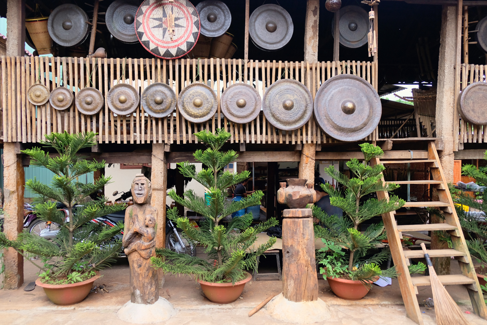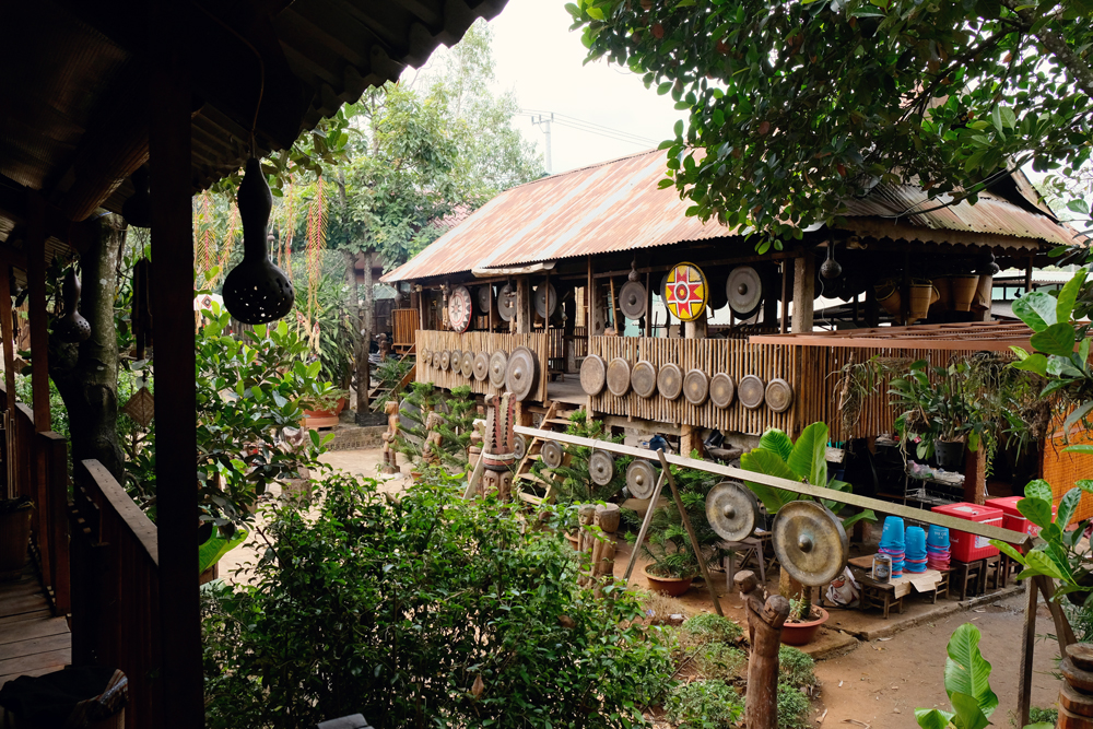 The communal house is the soul and symbol of village culture. Built in the shape of an axe blade, the house is made from natural materials of wood and bamboo. A bamboo pole, known in Vietnamese as ‘cay neu’, is installed in front of the house. The yard in front of the communal house is also the venue for villagers to hold festivals and gong performances.