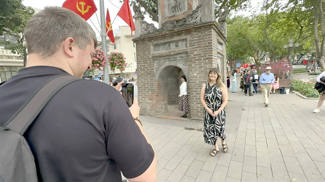 | Nerijus Petrokas, from Lithuania, takes photos of Waleria Hjelm, from Denmark, by Hoàn Kiếm Lake in Hà Nội. VNS Photo Lê Hương |
