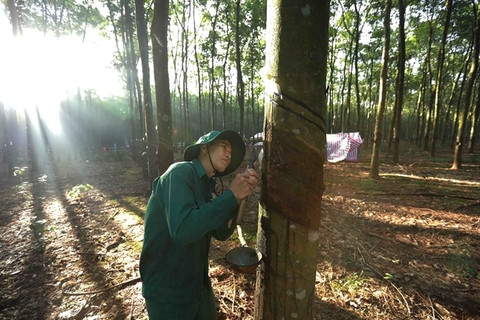 A worker of Vietnam Rubber Group collecting latex in a rubber plantation in Đắk Nông Province. The company's shares plummeted more than 6.1 per cent on Tuesday, weighing on the market's sentiment. — VNA/VNS Photo
