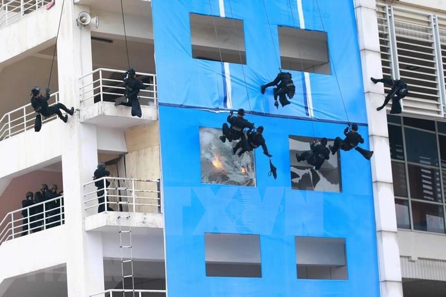 Hanoi Mobile Police force’s rehearsal to protect and rescue hostages from terrorists (Photo: VNA)