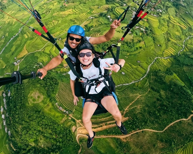 A tourist enjoys a flight to experience the stunning terraced rice fields in Mù Cang Chải District in the northern mountainous province of Yên Bái. |