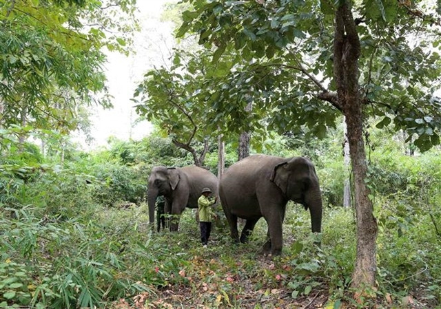 | Domesticated elephants are raised in a semi-wild environment in the forest area of KRông Na Commune, Buôn Đôn District in the central highland province of Đắk Lắk. VNA/VNS Photo Vũ Sinh |