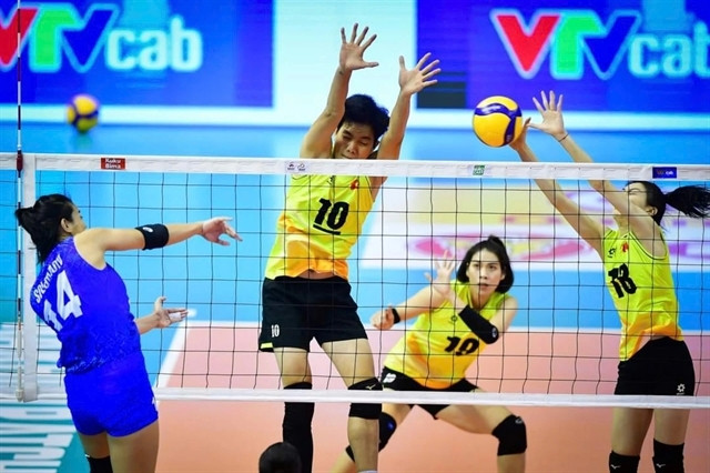 | Vietnamese players blocking an attack from a Thai player during the SEA V.League last month in Vĩnh Phúc Province. Photo Việt Nam Sport Team |