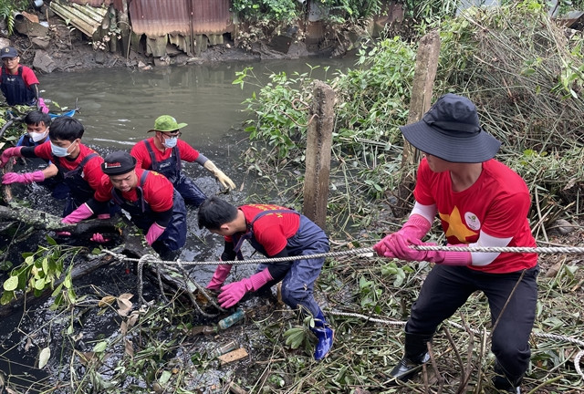 | Members of Biên Hòa Xanh Group drag waste out of a canal.—VNA/VNS Photo Lê Xuân |