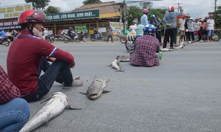 Last week farmers in Long Son Commune affected by the mass deaths protested by dumping their dead fish on a section of National Highway 51 that cuts through Long Son Commune.