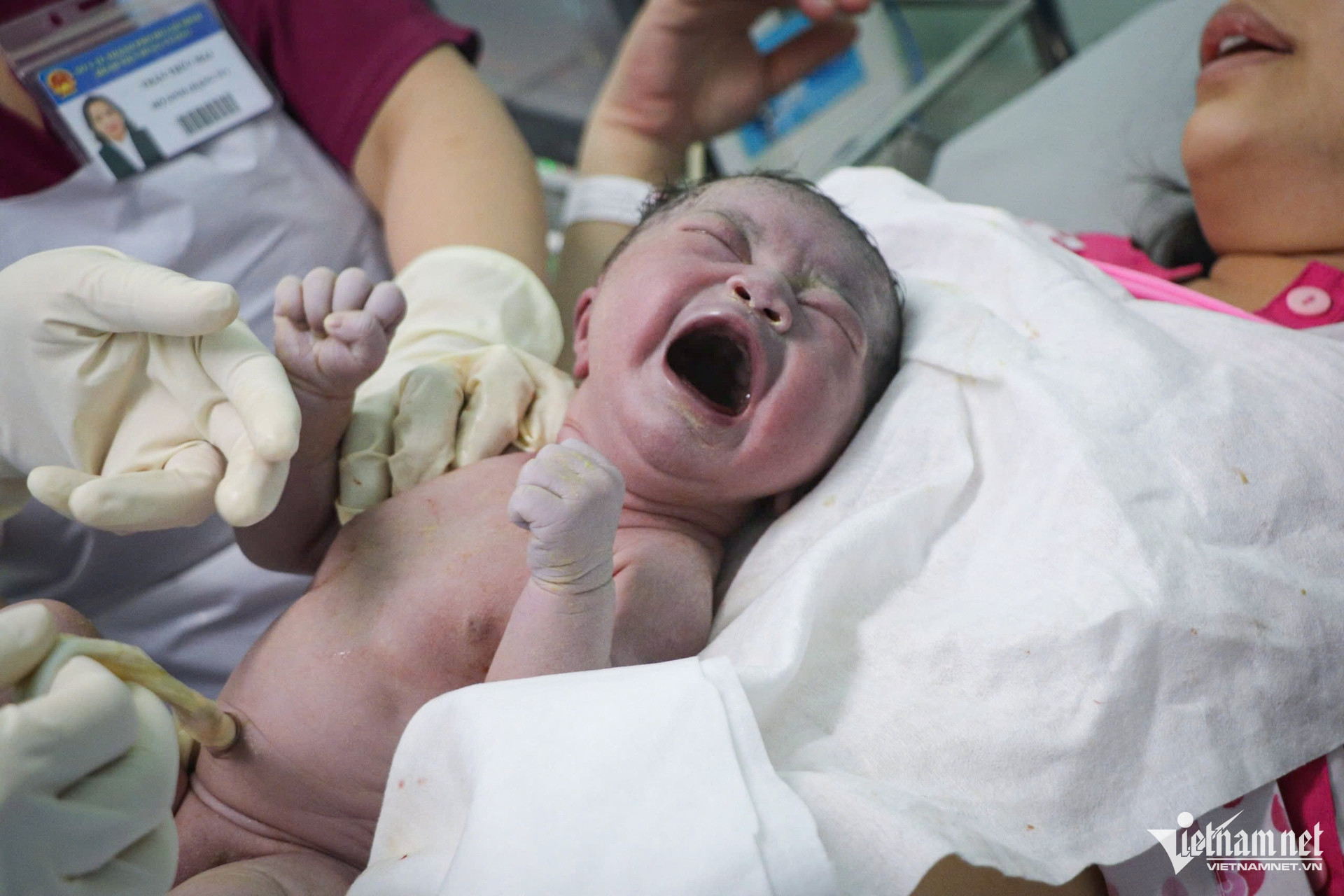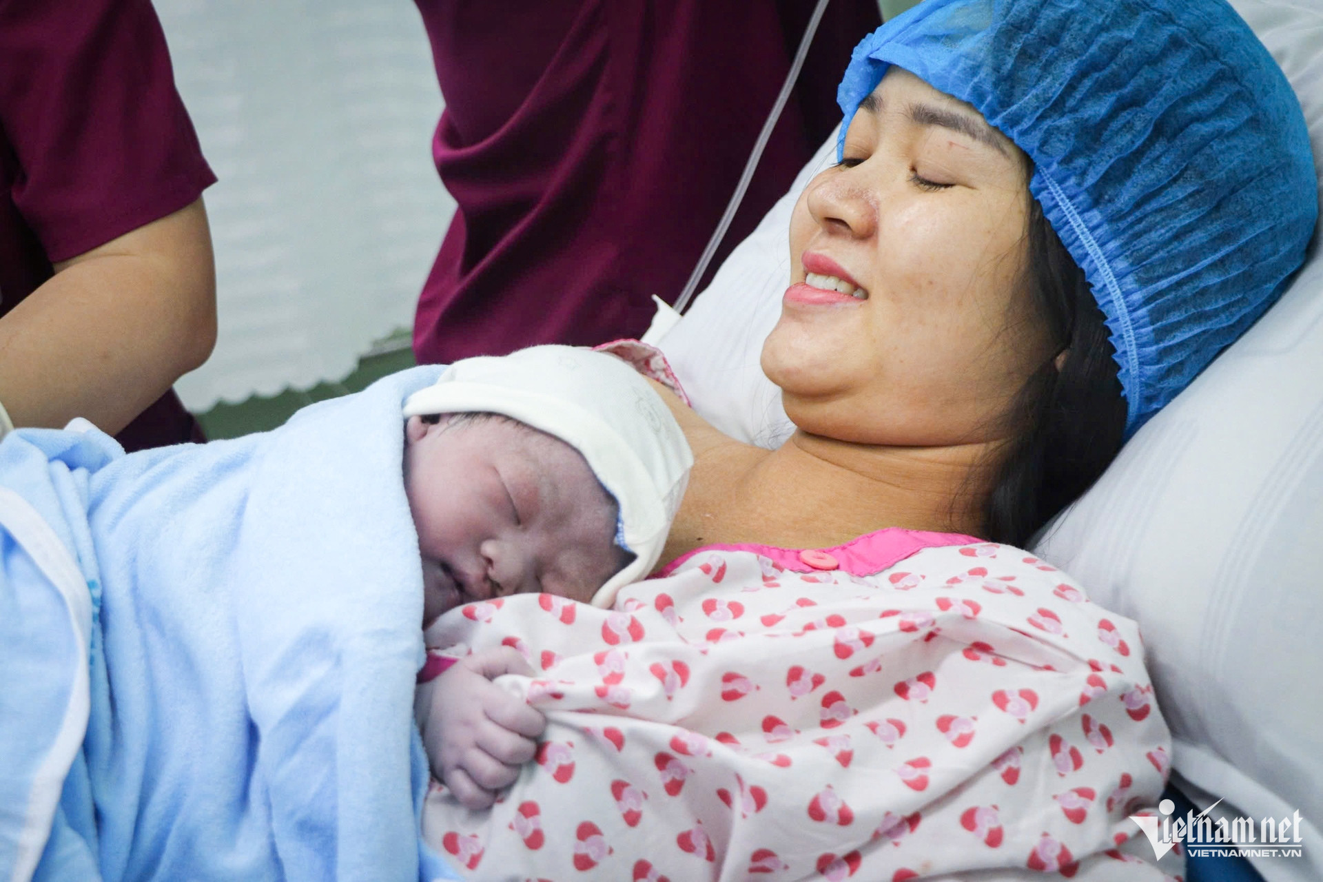 At Tu Du Hospital in Ho Chi Minh City, the delivery ward welcomed 11 newborns within the first 30 minutes of the new year through natural and cesarean births. The final night shift of 2024 at the hospital was bustling, with 40 doctors and nearly 200 medical staff attending to expectant mothers.At exactly midnight, as fireworks lit up the sky over Ho Chi Minh City, Thien Thanh, a 23-year-old mother from Thu Duc City, gave birth to her first child, a baby girl.Her mother, who accompanied her during labor, was overcome with emotion, holding back tears as she met her granddaughter for the first time. "This moment was so special, full of sweetness and joy," she said.Following her birth, the baby was placed skin-to-skin with her mother, a method known to foster bonding and provide warmth and comfort to newborns.Nearby, Phan Duc Lam, 28, excitedly called his family in Gia Lai Province to announce the arrival of his baby. His wife, 19-year-old Ngo Tuong Vi, had given birth to their first child, a baby girl, right at midnight - a surprise as she wasn’t due for another two days.The baby, weighing 3.1 kg, was carefully tended to by nurses who checked her umbilical cord, administered vaccinations, and transferred her to postnatal care.Tu Du Hospital also presented special gifts to the families of these first babies born in 2025.The baby of Mr. and Mrs. Phan Duc Lam weighs 3.1 kg (weighed without a blanket and after deducting the weight of the supporting equipment underneath)After weighing, the baby was examined by a nurse for the umbilical cord, given vaccinations, and then transferred to the postnatal care room.According to Dr. Vuong Dinh Bao Anh, Deputy Director of Tu Du Hospital, "Each birth at this time holds a unique significance, not just for the families but also for the medical teams who share in these joyous moments."At Hung Vuong Hospital in Ho Chi Minh City, four babies (three boys and one girl) were born shortly after midnight. Among them was baby Hải Đăng, the second child of a family, born 10 years after his elder sibling.