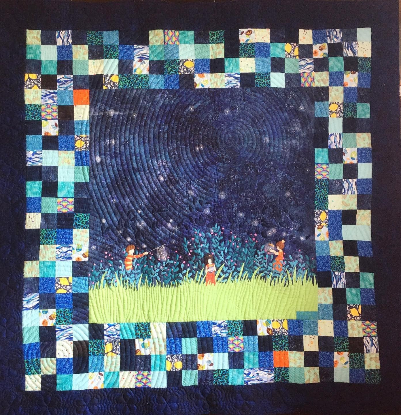 A blanket illustrates children catching fireflies.