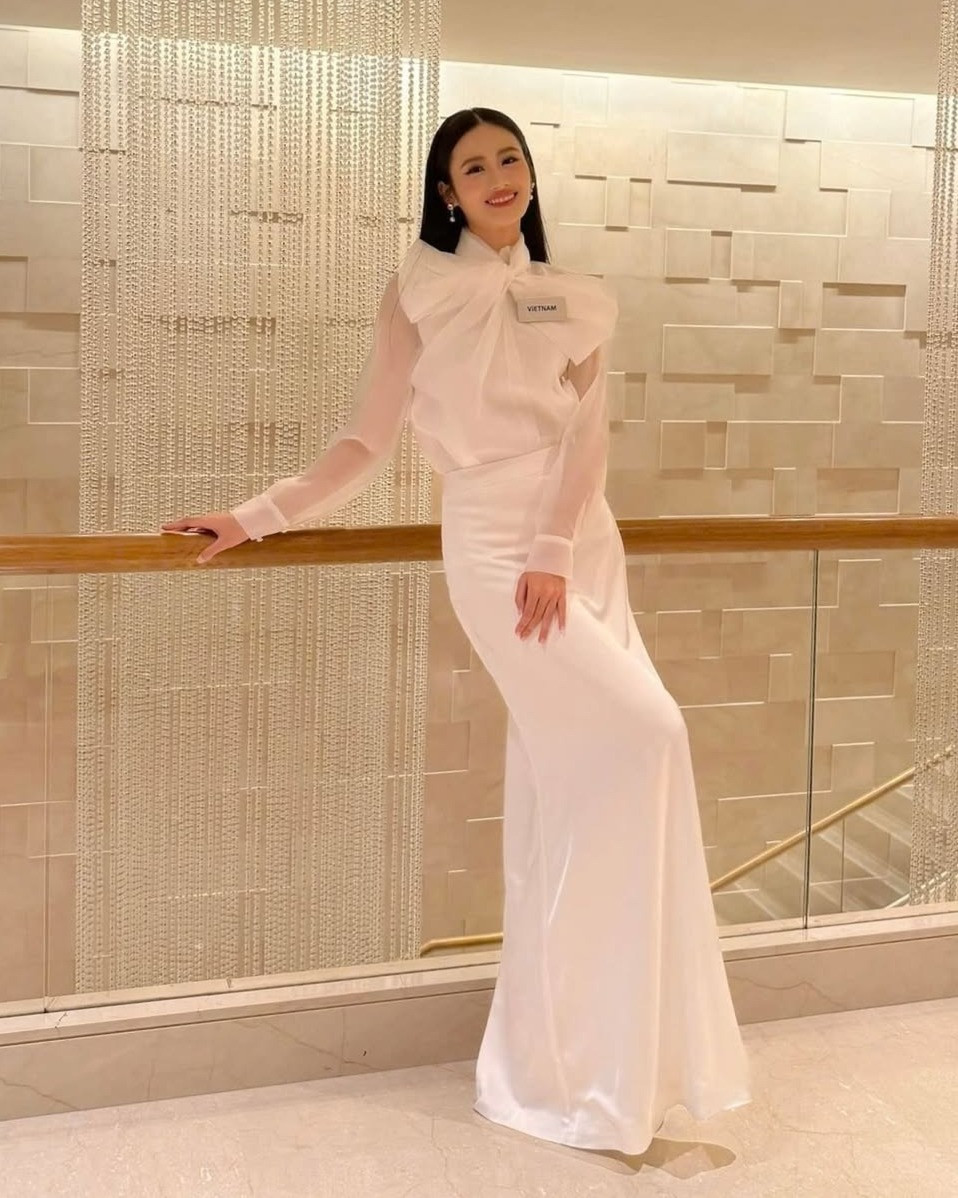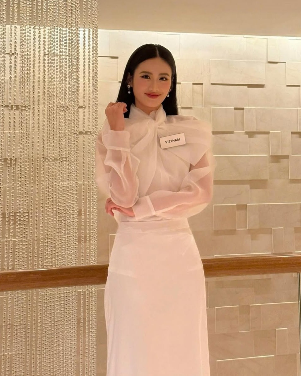 Wearing an elegant white dress, Y Nhi exuded sophistication and charm. Throughout her presentation, she maintained confident body language and a bright smile while speaking fluently in English.