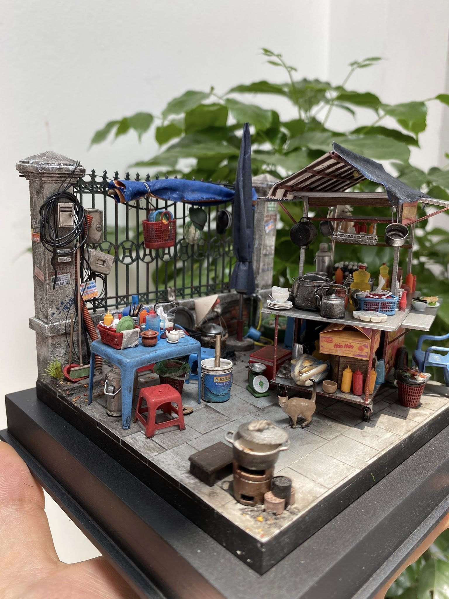 Armed with photos and his memories, Cuong began crafting his first model, sparking the birth of his “Hanoi Sidewalks” series. Without formal art or sculpture training, he relied on patience and dedication to replicate even the smallest details.