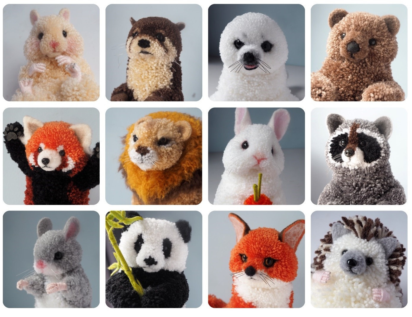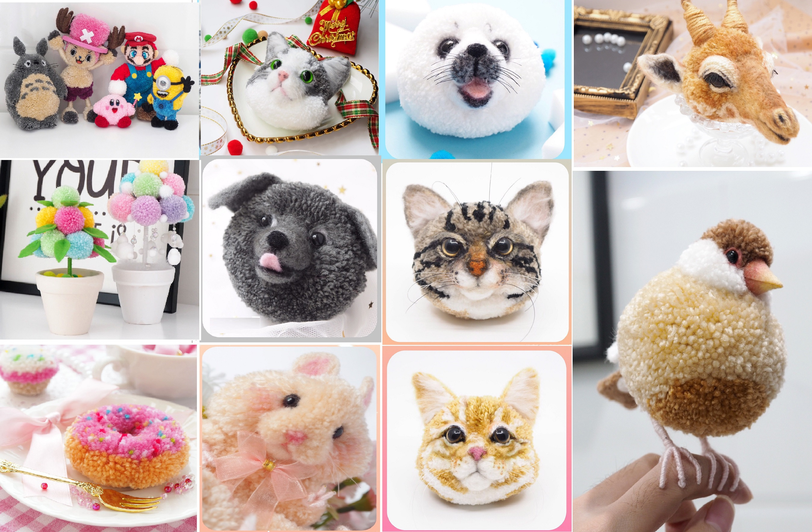 Pets or cartoon characters made of pom poms are beloved as house decorations or gifts.